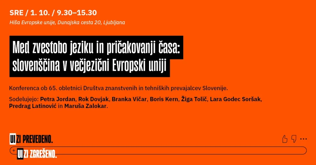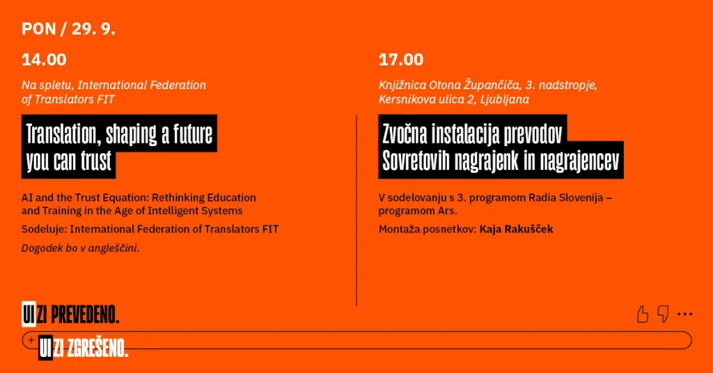 Posvet o jezikovnih poklicih in umetni inteligenci. Na posvetu bodo strokovnjaki z različnih zornih kotov obravnavali vprašanja etičnih vidikov, tveganja izgube jezikovne raznolikosti in kreativnosti, priprave na nove izzive ter delili najsodobnejša dognanja na različnih področjih prevodoslovja in jezikoslovja v luči vplivov razširjene rabe umetne inteligence. Posvet nadaljuje in nadgrajuje uspešno zgodbo prvega srečanja, ki je marca 2025 potekalo na Filozofski fakulteti Univerze v Mariboru pod naslovom Krasni ali strašljivi novi svet ter je del vseslovenske kampanje UIzi prevedeno, UIzi zgrešeno, ki opozarja na pomen in vidnost jezikovnih poklicev.