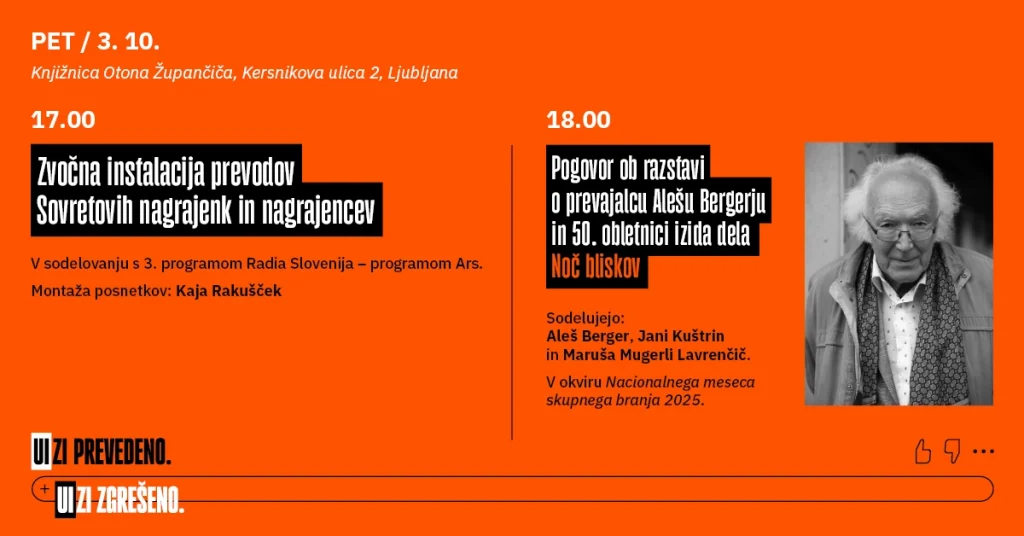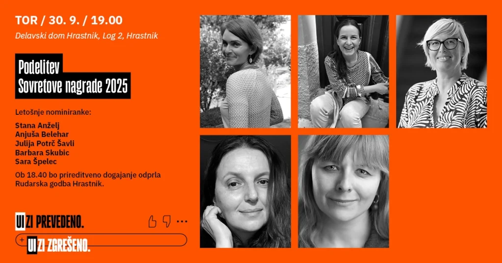 Slavnostna podelitev Sovretove nagrade 2025 Društva slovenskih književnih prevajalcev ob mednarodnem dnevu prevajanja in 140. obletnici rojstva prevajalca in prevodoslovca Antona Sovreta. Ob 18.40 bo prireditveno dogajanje odprla Rudarska godba Hrastnik. Sodelujejo nominiranke Stana Anželj, Anjuša Belehar, Julija Potrč Šavli, Barbara Skubic in Sara Špelec. Dogodek povezujeta Breda Biščak in Ana Černuta Deželak. Kulturni program: Društvo Marionetno gledališče Jurček in Mešani pevski zbor Prosavus. Video: Gaja Madžarevič. Po prireditvi bo v Hočijevi galeriji na ogled razstava v sklopu projekta Zgodovina slovenskega literarnega prevoda. Soorganizatorja prireditve: Društvo slovenskih književnih prevajalcev, Knjižnica Antona Sovreta Hrastnik in Občina Hrastnik.